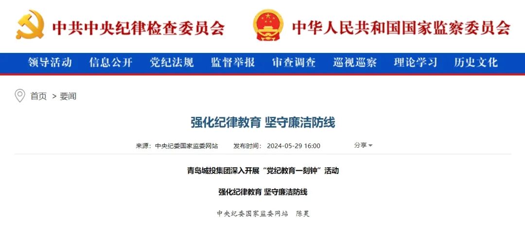 近日,《強化紀律教育 堅守廉潔防線 青島城投集團深入開展“黨紀教育一刻鐘”活動》相關專題報道在中央紀委國家監委網站首頁要聞欄目發表,青島城投集團基層黨組織深入開展黨紀學習教育的亮點做法再次獲得上級部門“點贊”。