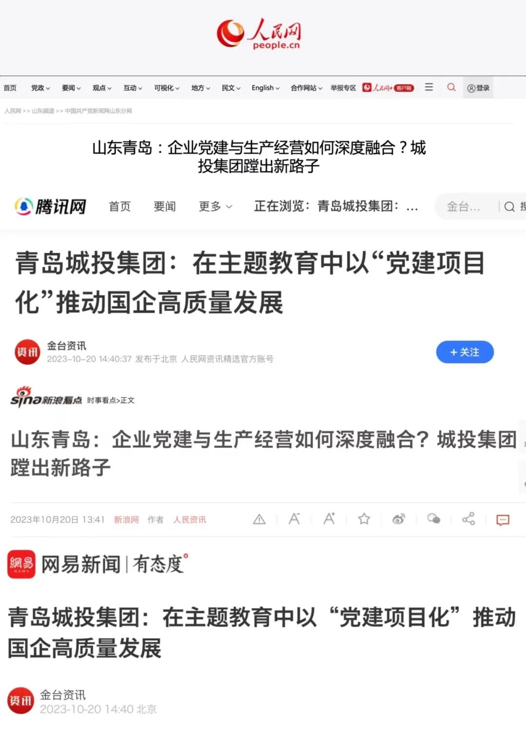 10月20日,人民日報旗下人民網(wǎng)在中國共產(chǎn)黨新聞網(wǎng)、人民網(wǎng)港澳臺版、金臺資訊、騰訊網(wǎng)、網(wǎng)易新聞、新浪網(wǎng)等知名媒體平臺集中報道了《在主題教育中以“黨建項目化”推動國企高質(zhì)量發(fā)展》《企業(yè)黨建與生產(chǎn)經(jīng)營如何深度融合?城投集團蹚出新路子》兩篇文章16次。青島城投集團“黨建項目化”的創(chuàng)新做法,為國有企業(yè)破解黨建經(jīng)營“兩張皮”難題給出“城投答案”,在互聯(lián)網(wǎng)引發(fā)熱烈反響。